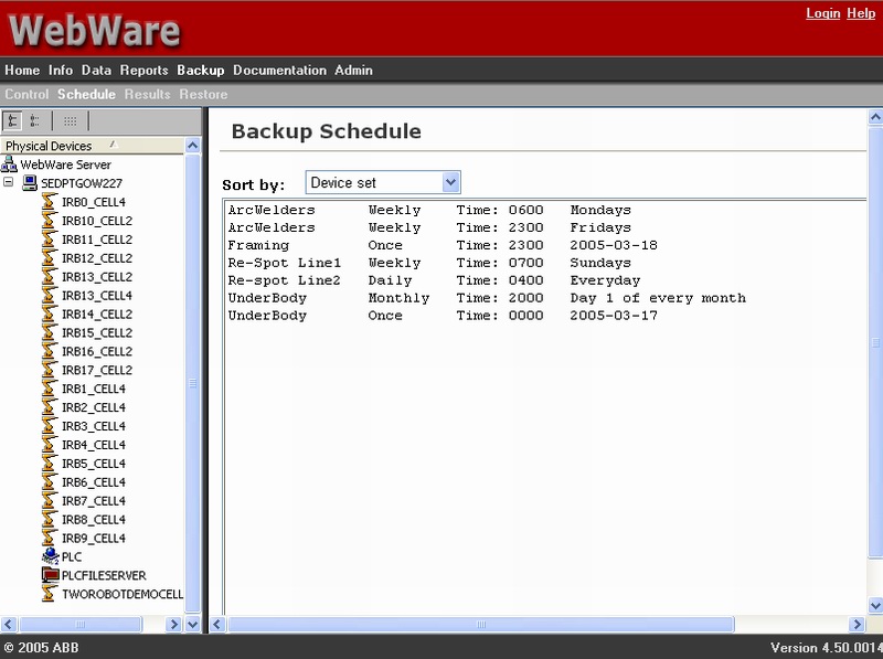 WebWare備bei份fen模mo塊kuai不bu需xu中zhong斷duan生sheng產chan就jiu能neng對dui機ji器qi人ren係xi統tong進jin行xing自zi動dong備bei份fen。備bei份fen計ji劃hua方fang式shi靈ling活huo,您nin可ke對dui機ji器qi人ren隨sui意yi編bian組zu,然ran後hou對dui每mei組zu機ji器qi人ren分fen別bie備bei份fen。各ge組zu機ji器qi人ren可ke采cai用yong不bu同tong的de備bei份fen間jian隔ge周zhou期qi,可ke每mei天tian備bei份fen、每周備份或每月備份。WebWare備份模塊可隨時訪問備份文檔,可將機器人程序、配置文件以及其它文件快速地恢複到機器人中。