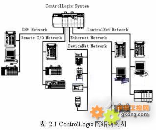 ControlLogix體係結構是目前非常先進的控製平台,該控製平台集成多種控製規程(如:時序、運動、驅動、過程)。它所應用的處理器核心為Logix5550。Logix5550具有強大的處理能力和靈活性,它支持一個ControlLogix機架上可以插入多個控製器、多個控製器可以穿越多個機架實現分布式控製、預定的處理器對處理器的通訊、多個處理器共享相同的I/O模塊和通訊模塊等眾多功能。ControlLogix背板是一種無源的總線,采用的是流行的生產者/消費者技術,因此具有效率高、數據傳送準確等優點;另外ControlLogix背板是一個網關級的模塊,可以進行各層網絡協議之間的轉化,因此可以通過一個普通的網卡便可以訪問其他各層網絡。如圖2.1為ControlLogix網絡係統結構圖。
