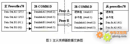 主從適配器初始化完畢,即可通過對主從變頻器的參數設置來完成現場的控製要求。例如將主變頻器的控製邏輯值通過數據鏈結A1送出,速度參照值由數據鏈結A2送出。即可通過主變頻器的人機界麵同時啟動、停止、轉向、diandongzhucongduotaibianpinqi。tongguotiaojiezhucongbianpinqidesuducanzhaobilaitiaozhengcongbianpinqixiangduiyuzhubianpinqideyunxingsudu,shicongdianjianyidingsudubigensuizhudianjidongzuo。qisududekezaixiantiaojiexingyouqishiyongyuzhengtiaoxianludedianjifenbieyongyuzhushebeibutongdesuduyunxing。meitaidianjiyoujunkeankongzhiyaoqiudulitiaojieqigecanshu。tongli,keyitongguoshujulianjieB來傳送主變頻器的其他參數如加減速時間等,從而更加精確地控製從變頻器的跟隨性能。主從變頻器間的連接及數據交換如圖3所示。