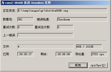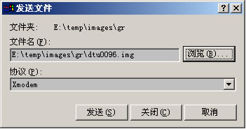 在配置主菜單選擇更新固件,出現提示“歡迎固件更新!”,選擇超級終端菜單 “傳送|發送文件”,選擇好新的固件文件,並選擇Xmodem協議。 點擊“發送”。