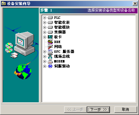 軟件設置 yingyongshijixingzutairuanjiankeyicongfuzadetongxungeshidebianzhizhongjietuochulai。shebeiqudongchengxuheshijixingyoujidejiehezaiyiqi。laiwanchengshujucaijiheshishikongzhi。duiyubutongdeyingjianshebei,liyongshijixingdeshebeianzhuangxiangdao,peizhixiangyingdeshebeiqudongchengxujike。zaishijixingdeliulanqixia。xuanzeshebeiqudong,yonghukeyianzhaoxitongdetishi,yiciwanchengI/O設備驅動參數的設置。其操作步驟如下: 1)設備安裝向導 雙擊設備安裝向導,出現設備安裝向導對話框,框中列出了工業生產中常用的一些硬件設備(如PLC、板卡、智能儀表、變頻器等)。如圖1所示: