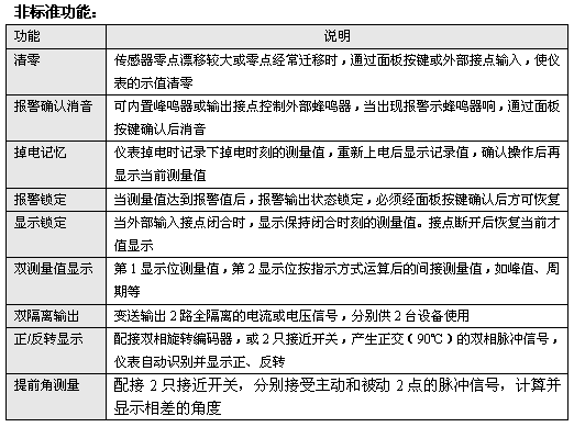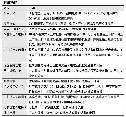 準 確 度:測量控製周期:0.5s,(信號頻率>3Hz時) 測量精度:0.100~45.000Hz 誤差小於0.01Hz 45.00~450.00Hz 誤差小於0.02Hz 450.0~4500.0Hz 誤差小於0.2Hz 4500~25000Hz 誤差小於2Hz 測量頻率範圍:0.1Hz~25kHz,超過25kHz應加預分頻單元 報警方式:10種報警方式,通過設定選擇。延時報警功能 繼電器輸出:觸點容量220VAC,3A OC門輸出(訂貨時注明):電壓小於30V,電流小於50mA 變送輸出:光電隔離 4~20mA,0~10mA,0~20mA直流電流輸出,通過設定選 擇。負載能力大於600Ω 1~5V,0~5V,0~10V直流電壓輸出,需訂貨時注明 輸出分辨力:1/4000,誤差小於±0.2% F.S 電 源: 220VAC供電的儀表:220V±10%,功耗小於7VA 24VDC供電的儀表:24V±10%,功耗小於5VA 12VDC供電的儀表:9~20V,功耗小於5VA 其它電源規格以隨機說明書為準 工作環境:0~50℃,濕度低於90%R.H 寬溫範圍的儀表需在訂貨時注明 顯示範圍:-19999~45000,小數點位置可設定 顯示顏色:測量值綠色,設定值紅色,光柱綠色,或按定貨要求