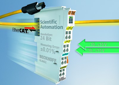 Beckhoff 將工程功能集成到自動化軟件中,使得這些功能超越了傳統的 PLC 和運動技術,並定義為“科學自動化”。這種理念的基礎就是:基於 PC 的控製技術性能的不斷提升和 EtherCAT 超(chao)高(gao)速(su)通(tong)訊(xun)係(xi)統(tong)。測(ce)量(liang)技(ji)術(shu)就(jiu)是(shi)科(ke)學(xue)自(zi)動(dong)化(hua)的(de)一(yi)個(ge)最(zui)佳(jia)例(li)證(zheng),迄(qi)今(jin)為(wei)止(zhi),測(ce)量(liang)技(ji)術(shu)都(dou)是(shi)通(tong)過(guo)一(yi)些(xie)專(zhuan)用(yong)於(yu)某(mou)些(xie)高(gao)性(xing)能(neng)應(ying)用(yong)領(ling)域(yu)的(de)專(zhuan)用(yong)設(she)備(bei)實(shi)現(xian)的(de)。而(er) EtherCAT 端子模塊 EL3602 可以將測量信號直接采樣到一個標準 I/O 係統中。2 通道模擬量輸入端子模塊 EL3602 用於處理 -10 到 +10 V 範圍內的信號。電壓分辨率為 24 位。在溫度為 25 °C 時,精度高達 0.01 %,因而能夠在機器或自動化試驗裝置上實現高精度測量任務。