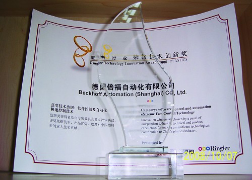 2008年9月23日,“2008 榮格技術創新獎-塑料業頒獎典禮”在上海淳大萬麗酒店隆重舉行。德國倍福的XFC-eXtreme Fast Control Technology(極速控製技術)榮獲其軟件控製及自動化類別之創新技術獎。作為獲獎單位,德國倍福應邀出席了頒獎典禮。