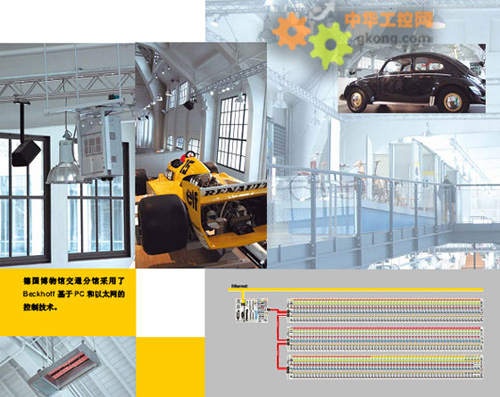 德國博物館原慕尼黑展覽中心第三大廳,離“博物館島”有些距離,如今,新第三大廳建築占地 2200 平米,加上二層走廊麵積,可展出麵積達到了 3000 平米。德國博物館的交通分館已搬遷至那裏,到 2005 年,交通館還將延伸至一號和二號展廳。隨新址落成,整套樓宇自動化係統也煥然一新。係統包含 PC接口、照明、采暖和通風設備的將近 1000 個接點,全部由 Beckhoff 的控製技術來實現。