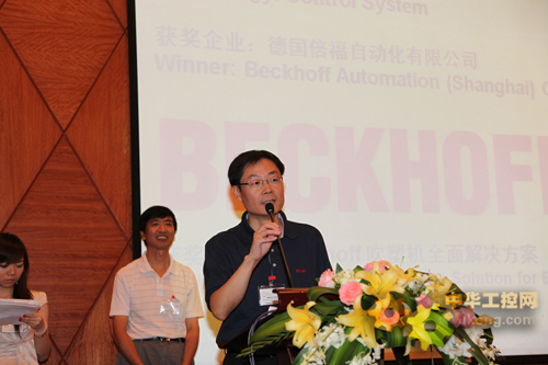 倍福中國區市場部經理彭捷代表公司上台接受頒獎,並致獲獎感言,“feichanggaoxinghuodezhegejiangxiang,zheyeshiliangnianlaiwomendiercidengshangronggejishuchuangxinjiangdebanjiangtai。ganxieronggegongyechuanmei,ganxiepingshenweiyuanhuidegeweizhuanjia,yeganxiesuoyouxiaibeifuchanpindekehupengyoumen。”彭捷經理還表示,針對全電注塑機係統、高檔擠出機係統,Beckhoff目前正在開發中,也請大家繼續關注我們。