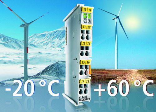 長期以來,Beckhoff 總線端子模塊係統在設備自動化和樓宇自動化領域已得到成功應用,其工作溫度範圍符合 0…55 °C(32…140 °F)的標準,可完全滿足這些應用領域的要求。而為了應對氣候條件比較惡劣的“室外應用領域”,Beckhoff 已將一些精心挑選的標準總線端子模塊和耦合器的工作溫度範圍擴展為 -20…+60 °C (-4…140 °F)。這些產品主要應用在新能源係統中,如風力發電、太陽能發電或潮汐發電設備,而這些設備經常需要在極端氣候條件下運行。