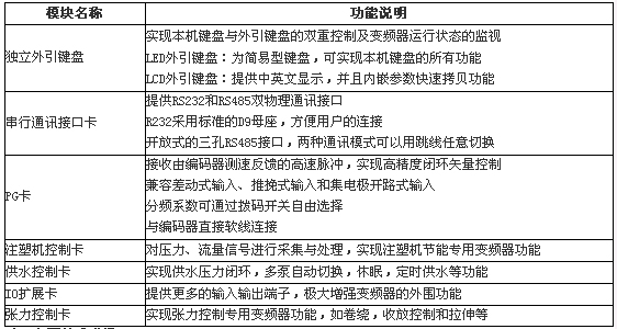 CHV係列變頻器,遵循模塊化設計理念,為客戶營造個性化的使用選擇;根(gen)據(ju)不(bu)同(tong)的(de)行(xing)業(ye)應(ying)用(yong)的(de)特(te)點(dian),設(she)計(ji)不(bu)同(tong)的(de)多(duo)功(gong)能(neng)擴(kuo)展(zhan)卡(ka),將(jiang)行(xing)業(ye)應(ying)用(yong)的(de)解(jie)決(jue)方(fang)案(an)內(nei)置(zhi)於(yu)擴(kuo)展(zhan)卡(ka)中(zhong),用(yong)戶(hu)僅(jin)需(xu)要(yao)一(yi)塊(kuai)擴(kuo)展(zhan)卡(ka),便(bian)能(neng)獲(huo)得(de)行(xing)業(ye)專(zhuan)用(yong)變(bian)頻(pin)器(qi)的(de)功(gong)能(neng),真(zhen)正(zheng)做(zuo)到(dao)低(di)成(cheng)本(ben)實(shi)現(xian)用(yong)戶(hu)定(ding)製(zhi)的(de)係(xi)統(tong)。