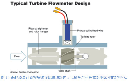 基於與人類曆史一樣古老的原理再結合運用新的技術,可有效提高渦輪流量計的測量準確性、可重複性及可靠性。 可用尺寸至12英寸 ( 300毫米)且能適應 10,000 psi (689巴)過程壓強及 1,000 βF(538℃)過程溫度的渦輪流量計,適用於全球化工、石化、製藥及食品飲料等行業應用。 渦輪流量計的基本構造是安裝在流體管中的一個裝有葉片的轉子(參見圖1)。隨著流體(氣體或液體)介質流過轉子葉片,即在每一葉片背麵形成一個低壓區,從而推動轉子轉動