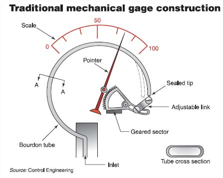 圖1:傳統的機械表使用的是一個彎曲的,閉合的“波登管”,當內部壓 力增加的時候,可能會使其變直。 兩種形式的壓力測量可以分為三類: ■絕jue對dui壓ya力li是shi對dui於yu絕jue對dui真zhen空kong得de出chu的de測ce量liang值zhi,它ta完wan全quan消xiao除chu了le大da氣qi壓ya力li值zhi對dui測ce量liang的de影ying響xiang。在zai一yi些xie應ying用yong場chang合he下xia,絕jue對dui壓ya力li的de讀du數shu對dui控kong製zhi過guo程cheng上shang下xia之zhi間jian的de聯lian係xi很hen有you幫bang助zhu,所suo以yi這zhe種zhong方fang法fa是shi研yan究jiu或huo設she計ji時shi的de首shou選xuan。但dan是shi要yao在zai傳chuan感gan器qi盒he內nei安an裝zhuang一yi個ge全quan真zhen空kong的de部bu分fen是shi很hen不bu實shi際ji的de,傳chuan感gan器qi通tong常chang是shi用yong一yi個ge固gu定ding的de校xiao正zheng係xi數shu或huo者zhe用yong更geng為wei複fu雜za的de單dan元yuan測ce 量大氣壓力值來對儀表讀數進行調節。 ■差cha壓ya是shi指zhi一yi個ge區qu域yu或huo容rong器qi內nei的de壓ya力li與yu另ling外wai一yi個ge之zhi間jian的de比bi較jiao。其qi讀du數shu就jiu是shi這zhe兩liang者zhe之zhi間jian的de差cha值zhi,並bing且qie即ji不bu需xu要yao考kao慮lv這zhe兩liang者zhe任ren何he一yi方fang對dui應ying的de大da氣qi壓ya值zhi也ye不bu需xu要yao考kao慮lv其qi真zhen空kong值zhi。 ■表壓,是差壓的一種形式,它是指一個區域或容器內的壓力與大氣壓之間的比較。這個是最實用的一種形式。 兩種壓力測量最常用的計量單位是psi和bar。前者現在在美國是常用的,但是後者現在正變得越來越通用。bar由於其數值表示更為便捷,現在已經大範圍地取代了帕和千帕。還有許多其他的計量單位,但是這些都是使用在特殊場合下的。psi和bar都使用後綴“a”或“g”來表示絕對壓力或表壓。當沒有後綴時,默認為表壓。 chayazhideceliangbuxuyaoquedingjueduiyalizhihuobiaoyazhi,yinweiliangzhezhijiandeceliangzhixuyaozhijiebijiaojiukeyile。qidushujiushiliangzhezhijiandechazhi,wufadechuliangzhegezidezhi。jiashelianggerongqizhijiandechayazhiwei50psi,一個容器內可能為10psi另一個為60psi,或者是一個為5000psi另一個為5050psi。如果沒有其他傳感器的話是沒有辦法確定相對於大氣壓的值的。差壓通常使用後綴“d”。 通常地,機械儀表都標配有曲麵波登管,也有許多其他可用的配置。雖然有許多形式的儀表,但是電子式的最為常用。 精度,測量範圍和安全 電子壓力儀表和機械儀表在表示精度時都是一樣的:按百分比確定誤差值。例如,一個高品質的0-500psi的機械儀表的精度為滿量程的±0.5%。這就意味著在其測量範圍內的任意一點其誤差範圍為5psi(±2.5 psi)。dianzichuanganqihebiansongqitongchangyeshiyongzheyangdejingduguifan。youyuliangchengyujingduguagou,suoyizaiyunxudeyalibodonghuotubianfanweinei,xuanzeceliangfanweilishijizhizuijiejindeyiqishifeichangzhongyaode。huanjuhuashuo,ruguonideguochengshiyunxingzai75psi壓力下的話,你選用精度都一樣的0-100psi的表會比0-500psi的(de)表(biao)要(yao)好(hao)。在(zai)選(xuan)擇(ze)和(he)使(shi)用(yong)壓(ya)力(li)儀(yi)器(qi)時(shi),錯(cuo)誤(wu)的(de)量(liang)程(cheng)選(xuan)擇(ze)是(shi)最(zui)常(chang)見(jian)的(de)一(yi)種(zhong)錯(cuo)誤(wu)。隻(zhi)考(kao)慮(lv)成(cheng)本(ben)的(de)采(cai)購(gou)商(shang)會(hui)為(wei)了(le)減(jian)小(xiao)成(cheng)本(ben)而(er)選(xuan)擇(ze)一(yi)種(zhong)壓(ya)力(li)儀(yi)器(qi),然(ran)後(hou)試(shi)著(zhe)將(jiang)其(qi)應(ying)用(yong)於(yu)一(yi)個(ge)很(hen)廣(guang)的(de)使(shi)用(yong)範(fan)圍(wei)。這(zhe)樣(yang)的(de)結(jie)果(guo)使(shi)精(jing)度(du)得(de)不(bu)到(dao)保(bao)證(zheng)。 一些變送器可以通過調節電路來調節其測量範圍。比如說,一個設計為可以測量0-500psi的元器件可以通過調節讓其隻顯示0-300的量程。這樣可以在4~20mA信號上得出相應的讀數區間,但並不是真正的增加了精度。大多數情況下,其最大的誤差值將會和滿量程0-500的誤差值一樣。 GE-Druck 公司的生產經理Tom Reid說:“在你汽車輪胎裏可能裝有2個或者3個傳感器,他們會給你的汽車儀表盤一個反饋信號。你不需要對你的右輪胎裏的壓力降低進行精確或快速的響應。”同(tong)樣(yang)的(de),你(ni)也(ye)可(ke)以(yi)將(jiang)這(zhe)個(ge)應(ying)用(yong)在(zai)隻(zhi)需(xu)要(yao)大(da)致(zhi)了(le)解(jie)一(yi)個(ge)容(rong)器(qi)內(nei)的(de)壓(ya)力(li)的(de)情(qing)況(kuang)下(xia)。隻(zhi)要(yao)機(ji)械(xie)結(jie)構(gou)和(he)外(wai)殼(ke)支(zhi)持(chi),那(na)麼(me)就(jiu)不(bu)會(hui)有(you)其(qi)他(ta)問(wen)題(ti)了(le)。所(suo)有(you)這(zhe)些(xie)都(dou)是(shi)取(qu)決(jue)於(yu)這(zhe)個(ge)過(guo)程(cheng)是(shi)否(fou)需(xu)要(yao)精(jing)密(mi)的(de)壓(ya)力(li)測(ce)量(liang)。