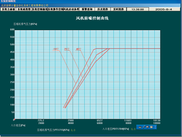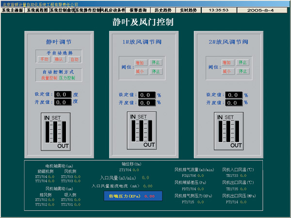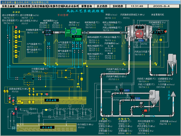 選定硬件設備後,需要按照如下的順序安裝熱備係統: ■安裝本地站和遠程站的電源模塊,CPU,RIO處理器,hot standby 模塊,TCP/IP模塊到背板,需要注意的是熱備係統兩個底板上安裝的模板種類和順序必須一致。兩個CPU地設備地址設定必須相同。兩個Ethernet模塊的IP地址設定必須相同。hot standby 模塊的指定滑動開關必須一個設定為A,另外一個設定為B. ■連接網絡,包括安裝RIO網絡和Ethernet網絡,按照網絡結構圖,分別安裝RIO處理器和遠程站之間的分支器和F接頭,連接RIO站間的同軸電纜,Ethernet交換機和網線; ■連接兩個hot standby 模塊之間的光纖。 編程和上位監控係統 首先確定編程和上位監控係統與PLC之間選擇TCP/IP的通訊協議。組態軟件Concept和上位監控軟件都支持TCP/IP的通訊協議,隻要將網絡搭建起來即可。遷鋼公司7000立方米風機熱備係統選用TCP/IP的通訊協議,需要的主要設備如下: ■編程和上位監控係統微機需配備Ethernet網卡; ■為了與熱備的PLC通訊,需要安裝Ethernet交換機; 另外,為了開發出理想的監控係統,選擇的監控軟件是美國TCPWonderware公司開發的InTouch8.0。InTouch是一個集成的、基於組CP/IP件的MMI係統――FactorySuite 2000中的一個核心組件。它具有美觀的HMI(人機接口界麵)和麵向對象的圖形開發環境,能夠高效、快捷地配置用戶的應用程序。其在穩定性,開放性,網絡功能,數據庫功能等方麵都具有很大的優越性。使用INTOUCH開發的監控畫麵包括顯示係統工藝過程的主畫麵,潤滑係統,軸振係統,軸位移係統等監控畫麵,以及報警、曆史曲線、實時曲線和報表等。係統的主要監控界麵如圖1,圖2,圖3,圖4所示。