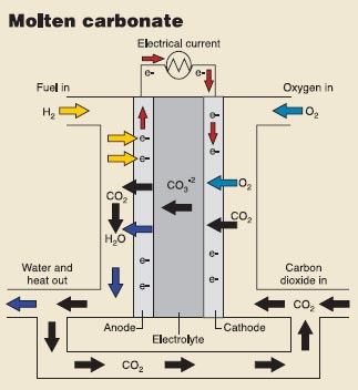 MCFC(熔融碳酸鹽燃料電池)采用懸浮在惰性陶瓷氧化鋁和氧化鋰混合基質中的熔融碳酸鹽合劑(鋰、鈉和鉀)為電解質。該電池工作在高溫下,因此電極不需攜帶貴金屬催化劑,也不需要外部氣體配置。這兩點特性降低了電池的總體成本。MCFC 的發電效率可達60%。