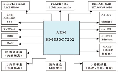 圖1:基於嵌入式WEB 的工業洗衣機遠程監控的總體結構圖 一般工業洗衣機的基本功能有:人機接口、電機控製、閥控製、洗衣機狀態檢測、溫(wen)度(du)檢(jian)測(ce)和(he)水(shui)位(wei)檢(jian)測(ce)。要(yao)實(shi)現(xian)遠(yuan)程(cheng)監(jian)控(kong)和(he)遠(yuan)程(cheng)故(gu)障(zhang)診(zhen)斷(duan),洗(xi)衣(yi)機(ji)還(hai)應(ying)具(ju)有(you)網(wang)絡(luo)功(gong)能(neng)。要(yao)實(shi)現(xian)智(zhi)能(neng)控(kong)製(zhi),即(ji)在(zai)洗(xi)滌(di)過(guo)程(cheng)中(zhong)控(kong)製(zhi)器(qi)能(neng)根(gen)據(ju)洗(xi)滌(di)物(wu)的(de)多(duo)少(shao)、髒(zang)汙(wu)程(cheng)度(du)和(he)髒(zang)汙(wu)性(xing)質(zhi)自(zi)動(dong)給(gei)出(chu)最(zui)佳(jia)洗(xi)滌(di)方(fang)案(an),這(zhe)就(jiu)要(yao)求(qiu)洗(xi)衣(yi)機(ji)具(ju)有(you)渾(hun)濁(zhuo)度(du)檢(jian)測(ce)和(he)布(bu)質(zhi)布(bu)量(liang)檢(jian)測(ce)功(gong)能(neng)。通(tong)過(guo)上(shang)述(shu)分(fen)析(xi),要(yao)實(shi)現(xian)工(gong)業(ye)洗(xi)衣(yi)機(ji)的(de)基(ji)本(ben)功(gong)能(neng)以(yi)及(ji)智(zhi)能(neng)化(hua)和(he)網(wang)絡(luo)化(hua),嵌(qian)入(ru)式(shi)係(xi)統(tong)至(zhi)少(shao)要(yao)有(you)以(yi)下(xia)接(jie)口(kou):LCD接口、觸摸屏接口(矩陣鍵盤接口、LED指示燈接口)、RS-232或RS485接口、UART接口、3路AD輸入、21路數字量輸出、8路數字量輸入(兩個可作為中斷源)及Ethernet接口,基於嵌入式WEB的工業洗衣機遠程監控的總體結構圖如圖1。 硬件設計 隨著嵌入式微處理器的發展,出現了Power PC、68K、MIPS、ARM等一係列低功耗、高性能的嵌入式CPU。因此選擇低成本的32位ARM係列嵌入式處理器,不但價格低廉,而且功耗低、處理速度快,應用前景廣泛,比較適合遠程監控需求。在工業洗衣機的遠程監控的係統中選用韓國現代公司的HMS30C7202(32位RISC 微處理器),這是一款具有高性價比的芯片。該芯片內集成了ARM7TDMI CPU核,存儲器管理單元(MMU),8KB的高速緩衝存儲器以及寫緩衝器。並具有豐富的接口:支持STN和TFT的LCD、觸摸屏、矩陣鍵盤、鼠標、LED指示燈、LAN、CAN、USB、RS-232、RS-485、紅外、24路繼電器輸出、10路數字量輸入、3路模擬量輸入和2路PWM輸出。為實現遠程網絡監控,係統底層網絡接口芯片采用CS8900A及外圍電路實現,本係統中網絡接口芯片CS8900A工作於16位模式。工業洗衣機遠程監控智能控製係統硬件框圖如圖2。