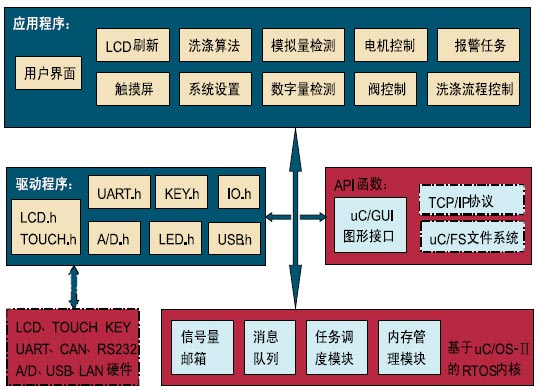 圖2:工業洗衣機遠程監控智能控製係統硬件框圖 軟件設計 軟件設計的核心工作是在上述硬件平台上建立嵌入式WEB服務器,實(shi)時(shi)響(xiang)應(ying)用(yong)戶(hu)的(de)請(qing)求(qiu)。除(chu)此(ci)之(zhi)外(wai)還(hai)要(yao)實(shi)現(xian)工(gong)業(ye)洗(xi)衣(yi)機(ji)的(de)智(zhi)能(neng)控(kong)製(zhi)。工(gong)業(ye)洗(xi)衣(yi)機(ji)係(xi)統(tong)需(xu)要(yao)進(jin)行(xing)多(duo)個(ge)參(can)數(shu)的(de)檢(jian)測(ce),需(xu)要(yao)使(shi)用(yong)多(duo)個(ge)傳(chuan)感(gan)器(qi),每(mei)一(yi)個(ge)傳(chuan)感(gan)器(qi)的(de)參(can)數(shu)檢(jian)測(ce)和(he)數(shu)據(ju)傳(chuan)輸(shu)方(fang)式(shi)也(ye)各(ge)不(bu)相(xiang)同(tong)。並(bing)且(qie)在(zai)洗(xi)滌(di)過(guo)程(cheng)中(zhong)有(you)很(hen)多(duo)需(xu)要(yao)控(kong)製(zhi)的(de)部(bu)件(jian),如(ru)變(bian)頻(pin)器(qi)、各種閥等;zaixitongzhonggegongnengmokuaiguanxifuza,renwuduo,erqiegezhongxuqiujianyoubingfaguanxi。lingwai,haiyouwangluogongneng。yinciyoubiyaoyinruqianrushicaozuoxitong。benxitongxuanyongμC/OS-II嵌入式操作係統,它是一個多任務強實時的開源操作係統,經裁減、移植與補充後形成工業洗衣機的專用實時操作係統。網絡通信協議TCP/IP采用源碼公開的1wIP協議棧,並針對具體需求進行優化設計。為了得到人性化的本地操作用戶界麵,采用了一種開源的圖形用戶界麵μC/GUI,它與μC/OS-II有很好的接口配合,功能完善。因此,工業洗衣機智能控製器軟件由四部分組成:實時操作係統μC/OS-II、硬件驅動程序、API函數和應用程序。具體結構如圖3: