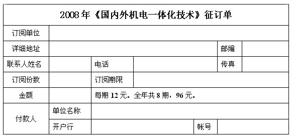 請將征訂單填好後傳真至: 2008年《國內外機電一體化技術》雜誌出刊8期,總體欄目具體設置如下: ●第一期(1月): 機電一體化技術 ●第二期(3月): 現場總線專欄 ●第三期(5月): PLC專欄 ●第四期(6月): 變頻技術 ●第五期(7月): 安全與自動控製專欄 ●第六期(8月): FA/PA展會專刊 ●第七期(9月): 工業以太網專欄 ●第八期(11月): 運動控製專欄 以下兩種彙款方式: 1. 工商行賬號: 戶 名:中國機電一體化技術應用協會可編程序控製器分會 開戶行:工商行德外分理處 帳 號:0200001309014423818 2.郵局彙款名址: 地址: 北京西城區德勝門外教場口一號1#樓406 郵編: 100011 收款人: 《國內外機電一體化技術》編輯部 彙款後請將底單傳真至:(010)62054956 聯係人:朱金鳳 聯係電話: |