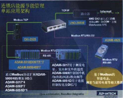 故研華推出整體的節能設備方案。首先利用工業數據采集器(ADAM-5510)將每間店的溫度、濕度進行管控,並對於每個設備所耗費的電量進行實時監控,並透過及時的內部以太網絡將數據傳達至現場的嵌入式工控機(UNO-2053E)。UNO一2053E為一台帶有2個LAN,2個RS-232的嵌入式工控機,其無風扇、無轉動部件的穩定性,多通訊端口的工業特性,並且內帶嵌入式的操作係統(xP embedded)以及功能強大的網絡化組態軟件(WebAccess)嵌入版,成為客戶選擇此嵌入式工控機作為此應用的最佳選擇,並透過外部網絡(遠程組態)將(jiang)這(zhe)些(xie)寶(bao)貴(gui)的(de)信(xin)息(xi)傳(chuan)回(hui)至(zhi)該(gai)企(qi)業(ye)的(de)管(guan)理(li)中(zhong)心(xin),進(jin)而(er)對(dui)每(mei)個(ge)分(fen)店(dian)進(jin)行(xing)數(shu)據(ju)的(de)分(fen)析(xi),而(er)做(zuo)出(chu)對(dui)於(yu)電(dian)量(liang)最(zui)佳(jia)使(shi)用(yong)的(de)控(kong)製(zhi)。若(ruo)是(shi)發(fa)現(xian)該(gai)店(dian)在(zai)非(fei)營(ying)業(ye)時(shi)間(jian)有(you)異(yi)常(chang)的(de)用(yong)電(dian)量(liang),則(ze)也(ye)可(ke)透(tou)過(guo)遠(yuan)程(cheng)組(zu)態(tai)下(xia)達(da)控(kong)製(zhi)指(zhi)令(ling)將(jiang)現(xian)場(chang)的(de)設(she)備(bei)進(jin)行(xing)管(guan)控(kong)的(de)動(dong)作(zuo)。透(tou)過(guo)研(yan)華(hua)成(cheng)套(tao)的(de)解(jie)決(jue)方(fang)案(an),客(ke)戶(hu)的(de)用(yong)電(dian)量(liang)總(zong)共(gong)節(jie)省(sheng)了(le)近(jin)40%。