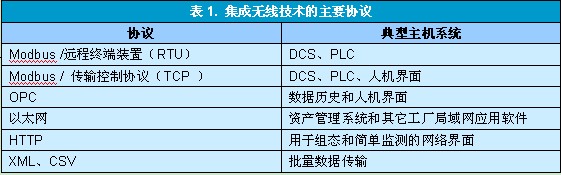 在把無線網絡加入到現有過程單元中的時候,主機係統的接口要求中會特別指出所需的網關接口。無線網關可與範圍廣泛的主機係統、PLC、過程曆史數據庫以及其它控製係統(圖6)和協議(表1)兼容。還可以在原有過程裝置中的現場儀表上安裝無線適配器,采集以前無法從主控係統獲得的診斷和測量數據。