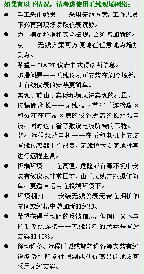 通過無線的監測功能來測試和評估無線技術幾乎沒有風險,用戶可以從並不昂貴的無線啟動包開始,逐步推廣到工程、運行和維護部門,無線技術可以提高設備可靠性、減少工廠停車時間、改進過程控製,並創造更安全的工作環境。