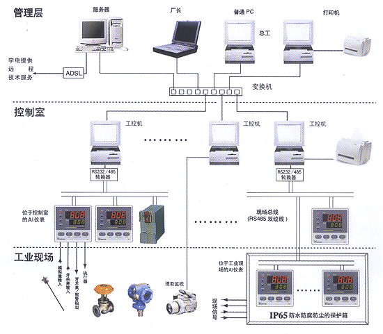 典型的企業綜合自動化係統是一種三層結構,分為管理層、控製層和現場設備層。管理層具備運行各種MES、ERP和可視化軟件,完成市場信息管理、經營決策、資源分配、排產計劃、生產調度等功能。控製層運行各種監控、工程組態等軟件,實現現場設備的監控、診斷及控製;而現場設備層則通過分布式現場網絡,完成數據采集、開閉環控製、報警等功能。若就實現這些功能的自動化部件來看,可以將其簡化為上位機(包括PLC和DCS)層和現場設備層。