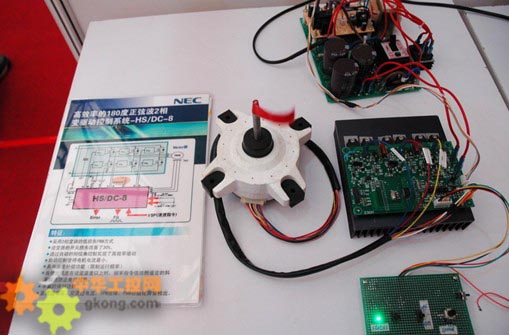 與展品同台展出的還有一些應用方案,而其中最受矚目的是NEC Motor Driver帶霍爾傳感器的三相永磁同步電機180度正弦波驅動馬達方案,以及NEC的POWER LED 驅動IC方案。NEC馬達解決方案采用兩相變調技術,可以講開關效率降低30%,具有自動相位控製,逆風啟動等優勢,該方案參數簡單,可以適應不同馬達的不同係統,提供源代碼、硬件參考設計,還有世強的FAE提供現場技術支持。