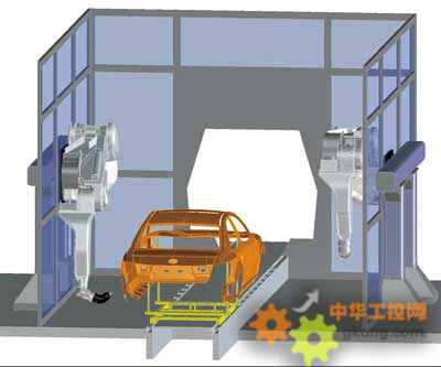 以移動模式工作的機器人塗裝站,由兩台懸掛的機器人進行外表麵噴塗
