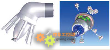 圖1中(zhong),手(shou)軸(zhou)部(bu)分(fen)可(ke)以(yi)選(xuan)擇(ze)用(yong)兩(liang)軸(zhou)而(er)不(bu)是(shi)三(san)軸(zhou),來(lai)連(lian)接(jie)產(chan)生(sheng)勻(yun)稱(cheng)的(de)霧(wu)化(hua)噴(pen)塗(tu)扇(shan)麵(mian)的(de)高(gao)速(su)旋(xuan)轉(zhuan)的(de)霧(wu)化(hua)器(qi)設(she)備(bei),這(zhe)樣(yang)不(bu)僅(jin)簡(jian)化(hua)設(she)備(bei)結(jie)構(gou),而(er)且(qie)隻(zhi)需(xu)要(yao)兩(liang)個(ge)軸(zhou)的(de)驅(qu)動(dong)係(xi)統(tong)。