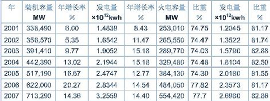 中國2001-2007年裝機容量和發電量
