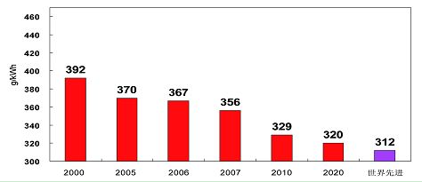 盡管我國節能減排的形勢嚴峻,但在國家的大力倡導下,電廠的節能減排工作還是取得了一定的成效,2007年,我國6000千瓦以上火電廠的電廠供電煤耗為356克/千瓦時,比2006年的367克/千瓦時降低了11克/千瓦時,是近年來下降幅度最大的一年。相當於全年6000千瓦以上火電廠生產節約標煤2423萬噸,占全年發電耗用標煤量的2.75%。在國家和電力企業的共同努力下,預計到2020年可以降低到320克/千瓦時,接近或達到世界先進水平(如圖1所示)。