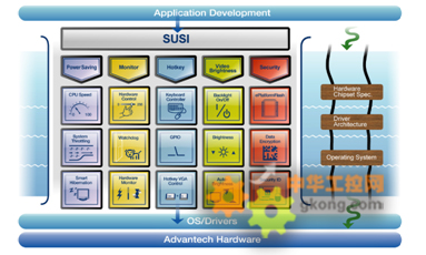 另外在中介軟件方麵,研華則推出了SUSI (安全和統一智能接口),SUSI是一組用戶友好的、智能的集成應用編程接口,可以縮短開發時間、增強安全性,並為研華平台用戶提供了附加價值。 SUSI 使應用的創建、操作和升級都變得更為簡單、快捷。SUSI的功能主要包括節能、監控、熱鍵、視頻亮度 、安全性等。
