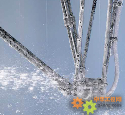 Bengtsson先生介紹說,FlexPicker是實現物體在兩點間迅速、精確、逐一移動的最先進的機器人之一。可衝洗版FlexPicker以抗腐蝕材料製成,覆有專用塗層,配備密封部件,設有特殊設計、帶滑動軸承的第4軸,便於洗滌劑清洗。FlexPicker采用食品衛生專用設計,適用於肉類、乳製品、熟食等散裝食品的包裝。若要滿足最嚴格的衛生標準,還可提供不鏽鋼可衝洗版。