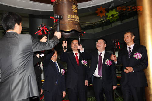 科士達公司董事長、深圳南山區領導與其它同批上市企業代表和領導敲響上市寶鍾