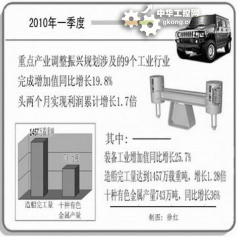 工業和信息化部公布的數據顯示,今年一季度,重點產業調整振興規劃涉及的9個工業行業完成增加值同比增長19.8%,增速同比加快15個百分點,比去年四季度加快1.9個百分點;頭兩個月實現利潤累計增長1.7倍。