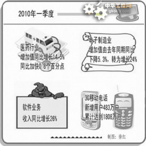 統計數據顯示,一季度醫藥行業增加值同比增長14.5%,同比加快0.8個百分點。電子製造業增加值由去年同期同比下降5.3%轉為增長24%。主要產品中,微型計算機設備產量增長54.8%,其中筆記本計算機增長53.7%;手機產量增長36.5%;彩電產量增長40.2%,其中液晶電視機增長79.5%;集成電路產量增長89.2%。全國電信業務總量同比增長21.7%,主營業務收入同比增長5.3%。3G業務全麵啟動,新增3G移動電話用戶483萬戶,累計達到1808萬戶,2010年3G投資預計950億元,一季度已完成60億元。軟件業務收入同比增長26%,軟件外包服務增長31%,軟件出口增長22%。
