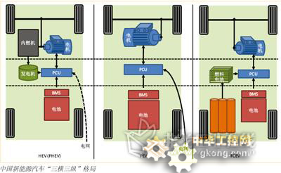 中國新能源產業始於21世紀初,新能源汽車研究項目則在2001年被列入國家“十五”期間的“863”重大科技課題。“十一五”以來,中國提出了節能和新能源汽車戰略,政府開始高度關注新能源汽車的研發和產業化。隨後的幾年間,中國自主研製的EV產品相繼問世,國內的比亞迪、奇瑞、吉利、長安和哈飛等汽車企業,也在新能源汽車市場中頻頻亮相,其中比亞迪在2009年北美國際汽車展展示了其PHEV F3DM/F6DM與PEV E6,成為了當時的亮點。經過10年的研發積累,我國新能源汽車已經形成“三縱三橫”的格局。“三縱”就是HEV(PHEV)、PEV、FCEV;“三橫”就是動力控製係統(PCU)、驅動電機和電池及電池管理係統(BMS)。