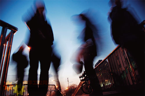 3月2日,北京一過街天橋上快速路過的行人留下虛影。CFP