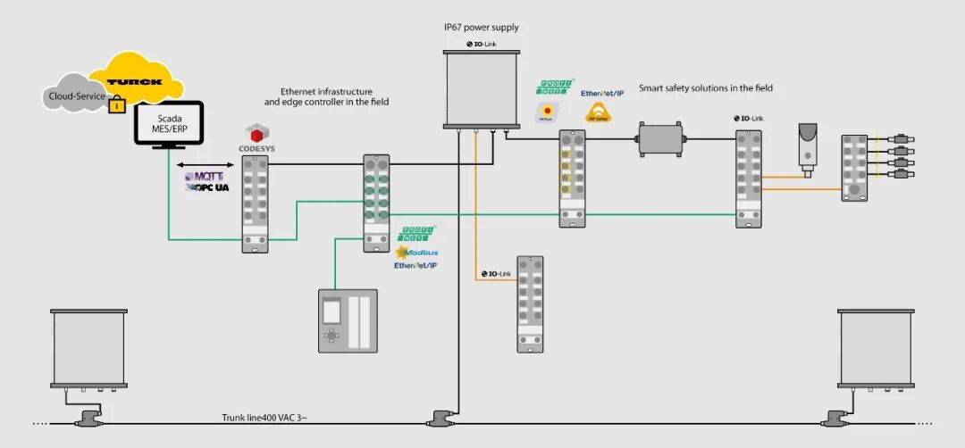 圖爾克推出了專門針對中小型工廠要求的網絡化機器安全解決方案:圖爾克Safe Link安全協議與TBEN-LL-4FDI-4FDX安全I/O模塊相結合,可通過分散安裝實現靈活、經濟高效的安全控製。多協議模塊支持Ethernet /IP、Profinet和Modbus TCP,並使用Turck Safe-Link協議進行安全交互通信。安全邏輯可直接內置到模塊中,並通過模塊的安全輸入和輸出實現。