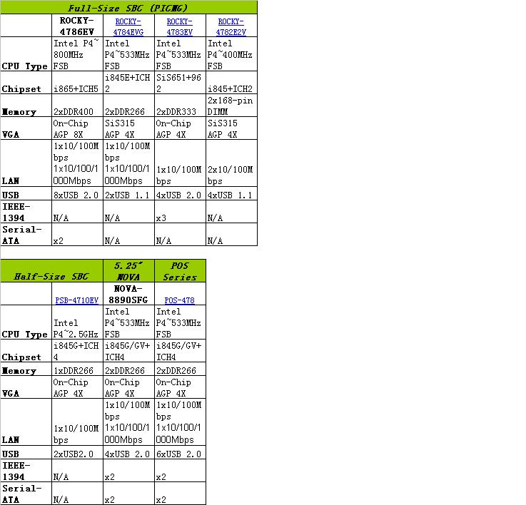 IEI發表的P4主板係列,有全球獨創之PIAGP係統的SAGP-865EVG、SAGP-648E與SAGP-845EV,長卡(Full-Size)符合PICMG標準的ROCKY-4786EV、ROCKY-4784EVG、ROCKY-4783EV與ROCKY-4782E2V,5.25吋Embedded係統用之NOVA-8890SFG,POS係統用之POS-478,PCISA短卡(Half-Size)規格的PSB-4710EV等,共計九款標準品,若加上功能彈性變化與可客製等項目,則高達數十款產品。