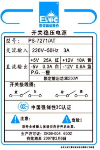 研祥公司PS-7271/AT開關電源於2004年8月19日通過國家認證機構的“CCC”認證,並獲得“CCC”認證證書,證書號為2004020907000392。