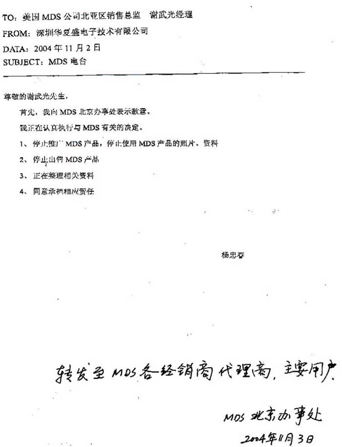 深圳華夏盛公司致美國MDS公司北京代表處的道歉信!