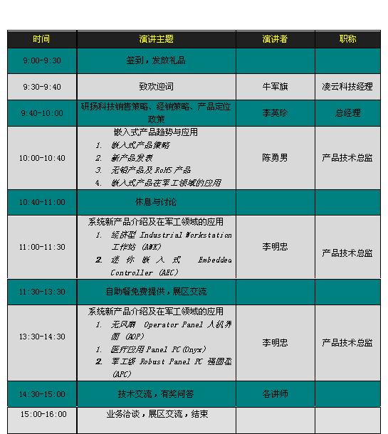 研揚科技集團總經理李英珍先生,副總經理吳正榮先生、顏誌展先生,北京辦事處經理黃誌山先生,產品技術總監陳勇男先生、李(li)明(ming)忠(zhong)先(xian)生(sheng),將(jiang)齊(qi)集(ji)古(gu)城(cheng)西(xi)安(an),與(yu)陝(shan)西(xi)淩(ling)雲(yun)科(ke)技(ji)各(ge)位(wei)精(jing)英(ying)聯(lian)手(shou)奉(feng)上(shang)研(yan)討(tao)會(hui)大(da)餐(can),屆(jie)時(shi)您(nin)不(bu)僅(jin)享(xiang)受(shou)到(dao)豐(feng)富(fu)的(de)午(wu)餐(can)和(he)西(xi)北(bei)人(ren)的(de)熱(re)情(qing),更(geng)會(hui)體(ti)味(wei)工(gong)控(kong)專(zhuan)家(jia)——研揚科技帶給您的精神大餐。