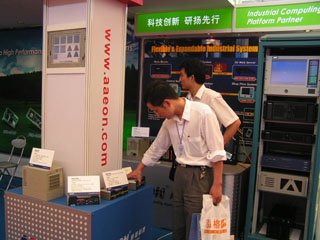 展位左側陳列的板卡中,FWB-880是防火牆家族的新成員,支持Intel® Pentium® 4/ 賽揚D CPU。在展位最醒目位置的立柱上有液晶屏做動態演示,控製它的是擺放在立柱下方的我們目前正在促銷的壁掛式工業係統——AMC-250。正如大家看到的,它結構小巧、簡單,CPU無風扇設計,壽命更長,是工廠自動化等領域的最佳選擇。