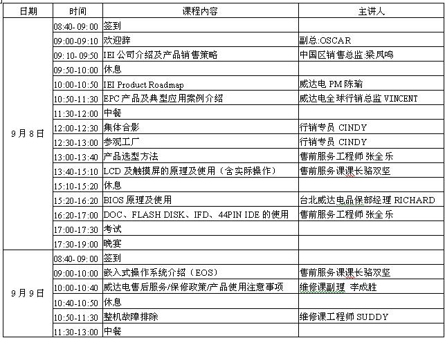 達電為與經銷商建立良好的溝通平台,協助經銷商培養優秀客服人員(AE),特在威達電中國總部舉辦威達電經銷商AE培pei訓xun班ban。此ci次ci培pei訓xun內nei容rong把ba理li論lun與yu實shi際ji操cao作zuo相xiang結jie合he,讓rang客ke服fu人ren員yuan能neng真zhen正zheng學xue到dao實shi用yong知zhi識shi。通tong過guo培pei訓xun考kao試shi的de客ke服fu人ren員yuan將jiang得de到dao威wei達da電dian頒ban發fa的de認ren證zheng書shu,成cheng績優異者還將獲精美獎品。為了保證培訓的高質量,培訓班每期有名額限定,請各經銷商指派1-2名代表參加,培訓期間,威達電免費提供食宿(往返交通費自付)。