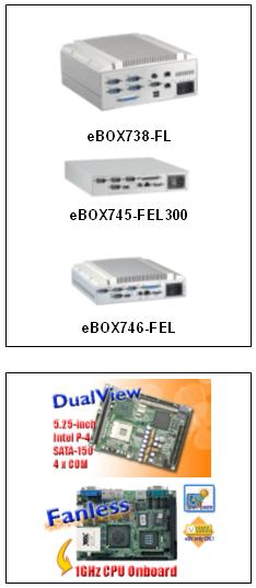 其中有eBOX738-FL,eBOX745-FEL300,eBOX745A-EFL300,eBOX746-FEL可供選擇內置低功耗無風扇主板為諸如數據傳輸、網絡應用、移動係統等特殊領域的應用帶來高穩定和可靠的係統。全部的應用基於Pentium® M/NS geode/VIA EDEN處理器,這種高效能和低成本的CPU主頻從300MHz 到1.4GHz.可自由選擇,操作溫度可在-20—60度,適合於各種苛刻的應用。支持多串口、2.5"硬盤接口及CompactFlash。無風扇設計是低功耗PC的最好解決方案,它配置靈活,可以使用Windows XP Embedded, Windows CE或 Linux操作係統。
