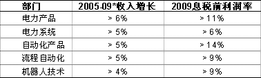 2005年9月6日,瑞士蘇黎世訊 – 全球電力和自動化技術領導廠商ABB集團今日宣布了2005至2009五年中期發展目標。ABB集團同時提出了強化改進業務執行,從更寬的領域去創造價值的戰略,包括專注於業務業務增長、改善盈利、資本利用和增加現金。