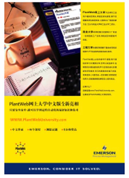 2005年9月12日(中國上海)—艾默生過程管理PlantWeb工廠管控網網上大學中文版改版,全新亮相。新的版本具有友好的用戶界麵,操作方便。您能夠學習46個課程,並能獲得有關最新自動化技術和商業信息的5篇白皮書。與英文版本一樣,用戶在學習完每一個課程後,可以進行自我測試。此外隻要學完一定的課程,就可累積一定的積分,還能兌換豐富的獎品。