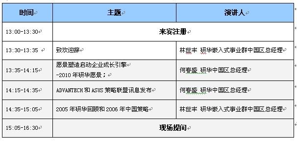 為了感謝各位媒體同仁對研華的關注和支持,研華科技特擬定於2005年11月15日舉辦“研華人·衝鋒願景—2005年研華科技媒體說明會”。我們誠摯地邀請您屆時能出席此次活動,您將會主要了解到: