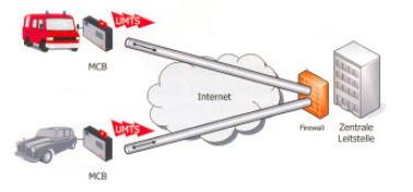 在這個案例中 , 一台電腦使用無線 UMTS 或 GPRS 卡來定位車輛 . 通過無線局域網 , 活躍區域內設備來監控車輛信息 . 當車輛進入這個無線局域網區域時 , 它就可以連接到控製中心來下載信息 , 或從總部接收並更新信息。