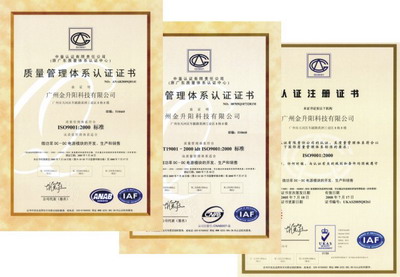 廣州金升陽科技有限公司自2002年6月通過了ISO9001:2000質量體係認證後,一直將ISO9001質量管理體係貫穿於整個設計、生產、銷售各環節中,經過三年的不斷更新完善,廣州金升陽科技有限公司的質量管理能力步上了一個新的台階。