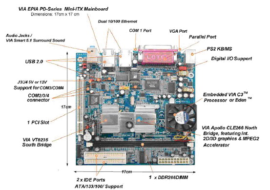 Mini電腦的核心在於需要一個微型的主板,威盛在今年推出了EPIA係列的新品PD係列,17cm×17cm的超小型體積裏完全能達到了普通個人電腦的性能要求,並且有足夠齊全的標準接口供人使用。