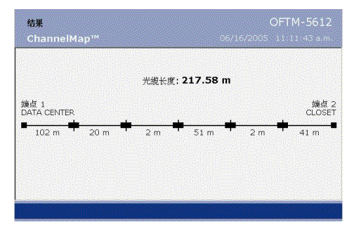OptiFiber 的通道圖(ChannelMap)功能將 OTDR 數(shu)據(ju)表(biao)示(shi)為(wei)簡(jian)單(dan)的(de)圖(tu)表(biao)或(huo)圖(tu)形(xing),顯(xian)示(shi)連(lian)接(jie)頭(tou)的(de)位(wei)置(zhi)和(he)數(shu)量(liang)。維(wei)護(hu)人(ren)員(yuan)可(ke)以(yi)很(hen)容(rong)易(yi)看(kan)懂(dong)和(he)解(jie)釋(shi)的(de)簡(jian)單(dan)的(de)鏈(lian)路(lu)圖(tu),能(neng)快(kuai)速(su)準(zhun)確(que)的(de)判(pan)斷(duan)出(chu)光(guang)纖(xian)鏈(lian)接(jie)的(de)結(jie)構(gou),並(bing)能(neng)識(shi)別(bie)短(duan)至(zhi)1米的跳線。